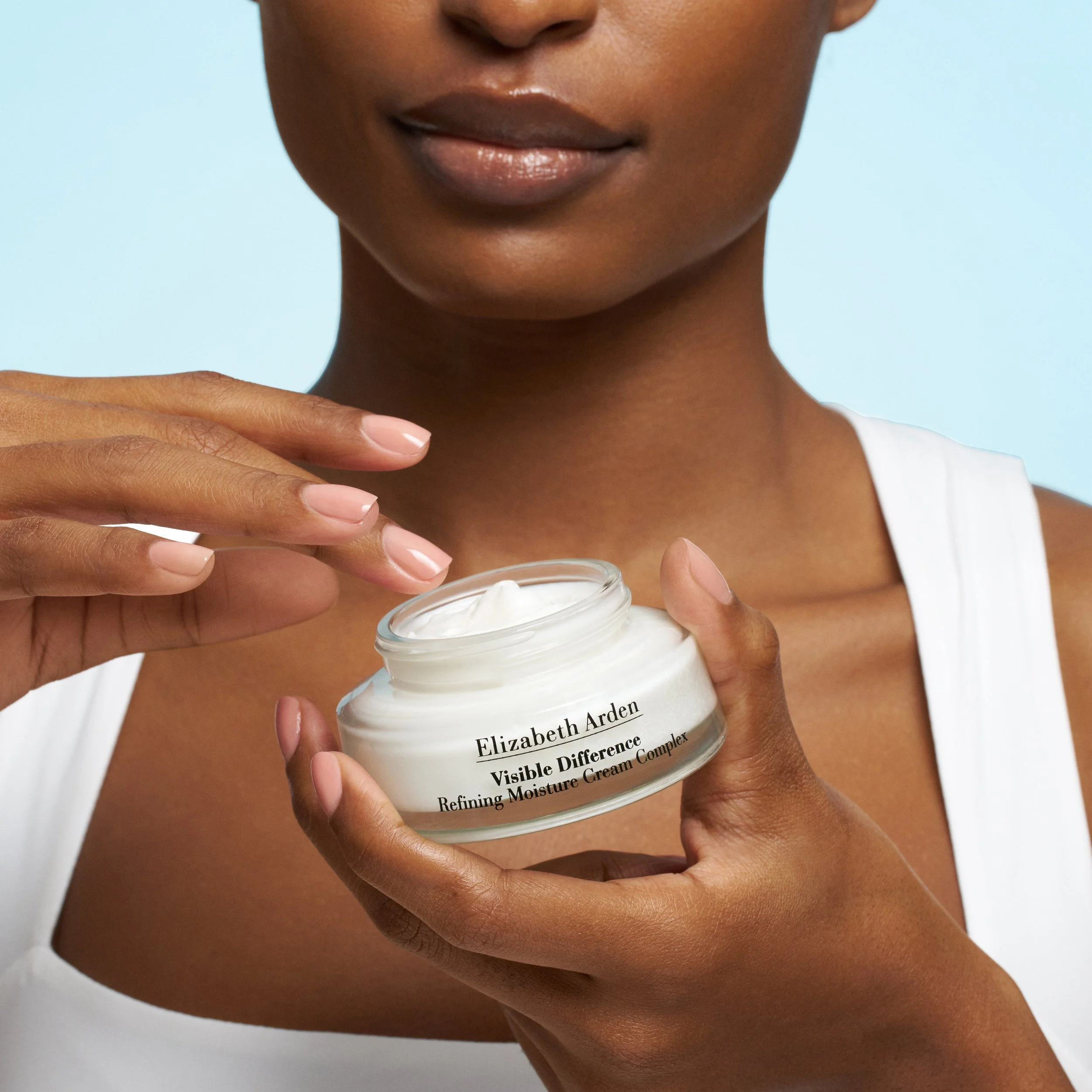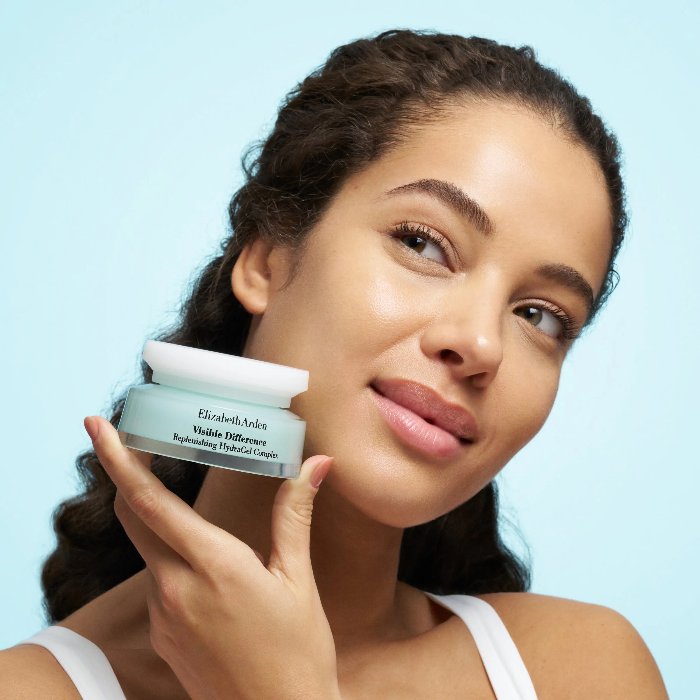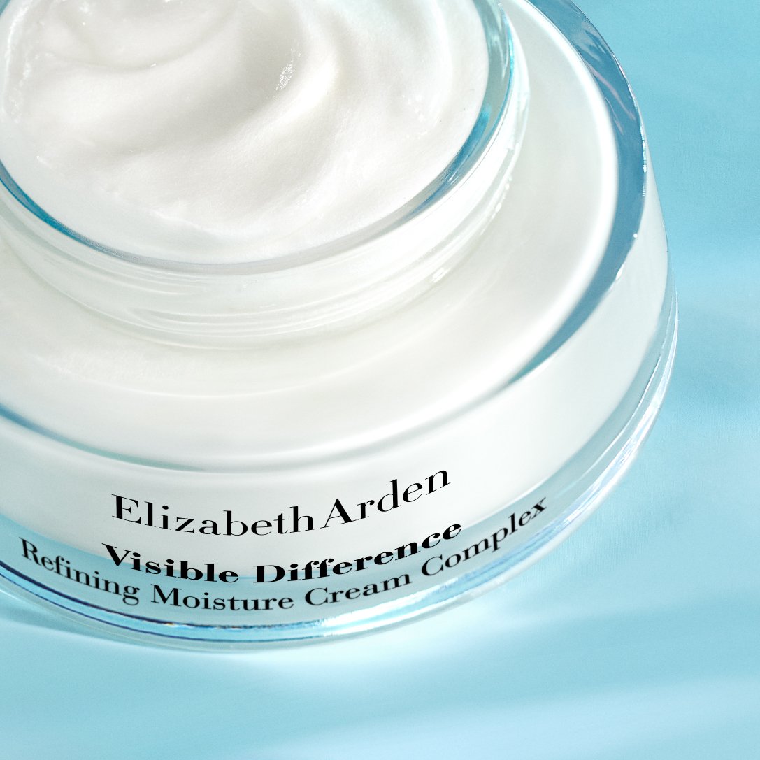 Campaign: Highlight the hydrating benefits of the Visible Difference skincare line with clean, fresh model photography. In the product photography, moving lights highlight the glass of the products to create the feeling of water in motion.